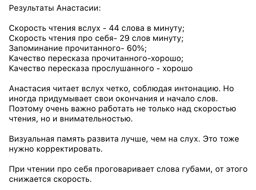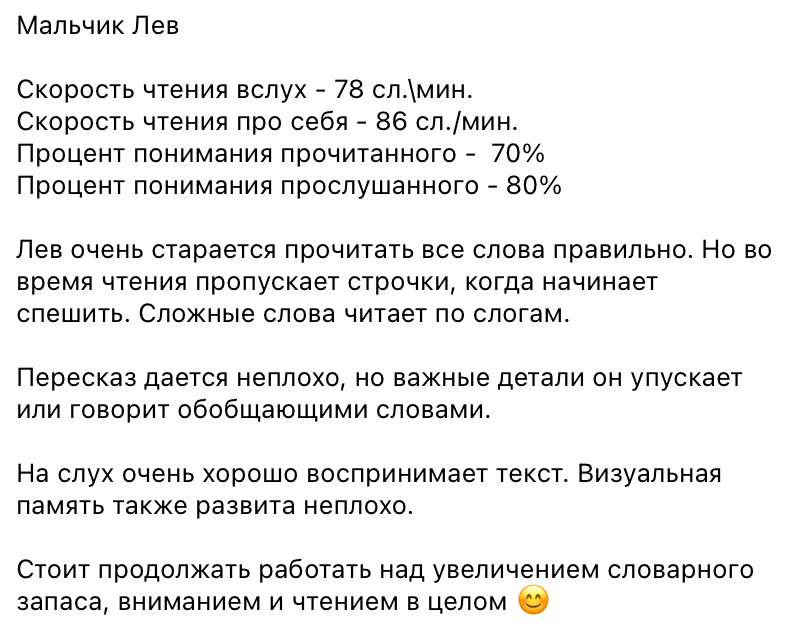 Определим скорость чтения ребенка, процент запоминания информации и оценим качество пересказа.