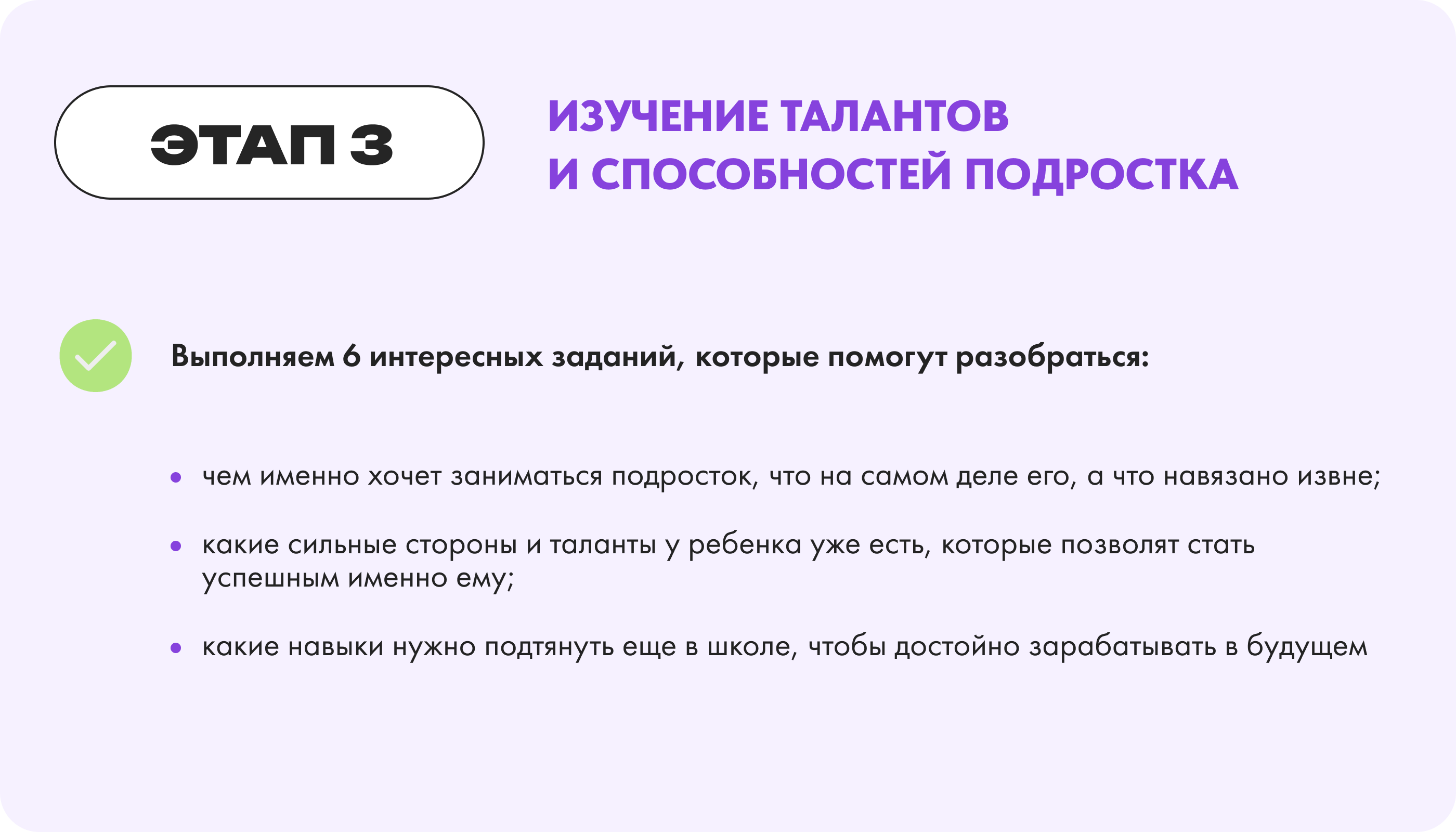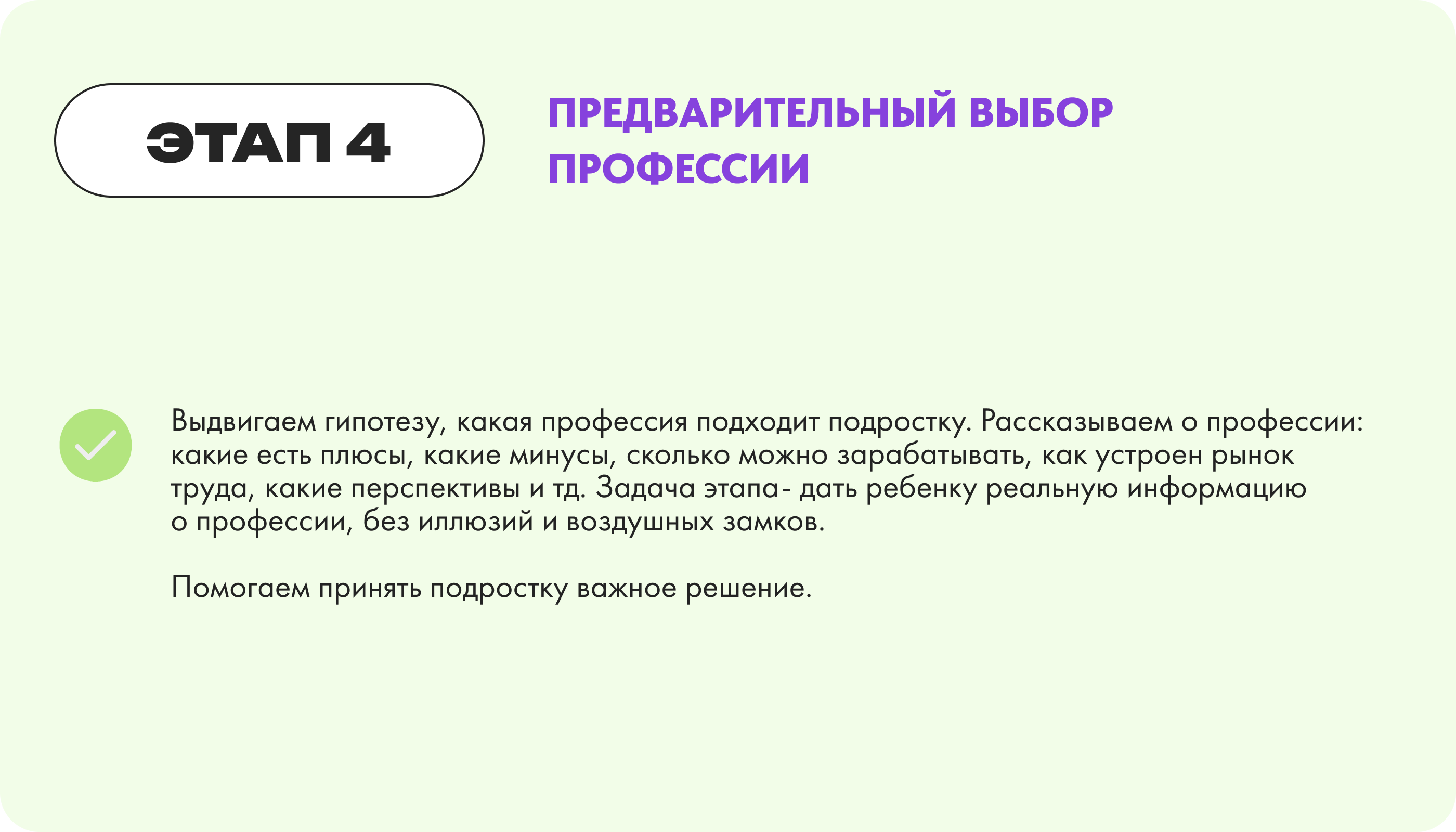 Выдвигаем гипотезу, какая профессия подходит подростку. Рассказываем о профессии: какие есть плюсы, какие минусы, сколько можно зарабатывать, как устроен рынок труда, какие перспективы и тд. Задача этапа- дать ребенку реальную информацию о профессии, без иллюзий и воздушных замков.