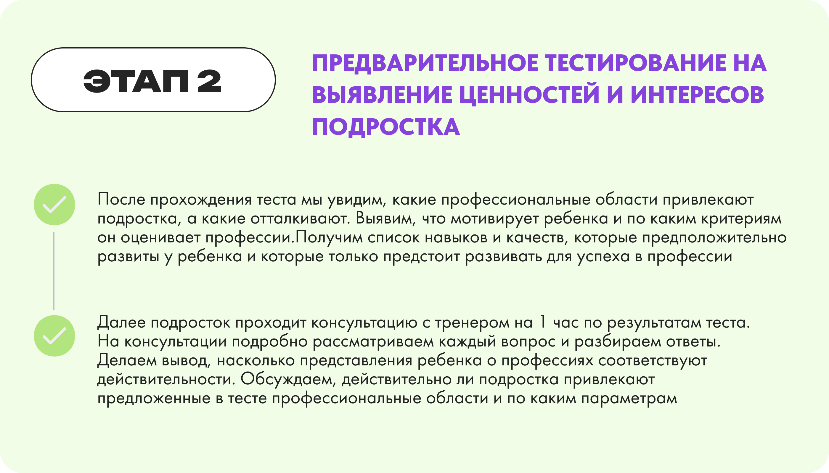 Далее подросток проходит консультацию с тренером на 1 час по результатам теста. На консультации подробно рассматриваем каждый вопрос и разбираем ответы. Делаем вывод, насколько представления ребенка о профессиях соответствуют действительности. Обсуждаем, действительно ли подростка привлекают предложенные в тесте профессиональные области и по каким параметрам