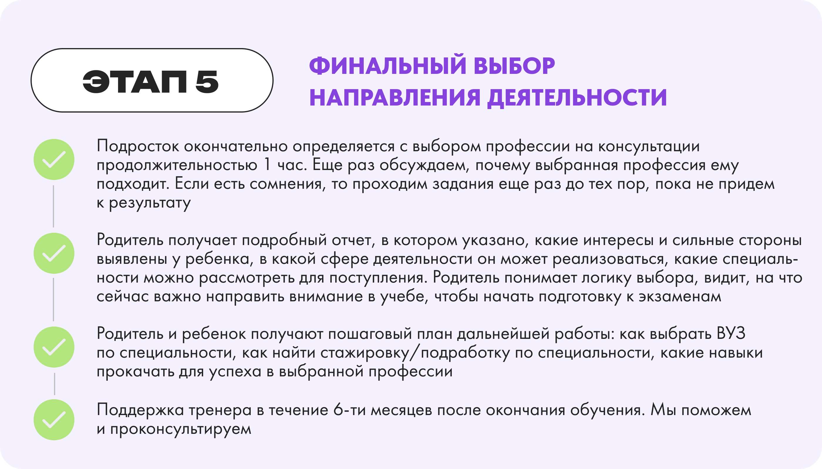 Родитель и ребенок получают пошаговый план дальнейшей работы: как выбрать ВУЗ по специальности, как найти стажировку/подработку по специальности, какие навыки прокачать для успеха в выбранной профессии